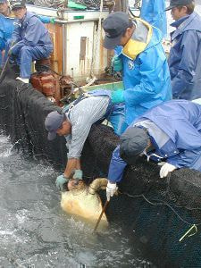 ウミガメの個体数が減少した原因のひとつとして、外洋でのマグロ延縄漁や流し網漁などによる混獲にあったことが世界的に認識されており、漁法や操業海域の規制により成果が現れはじめています。沿岸でも様々な漁法によってウミガメは混獲されていますが、ほとんどは生きたまま放流されています。しかし、底引き網や中層定置網、刺し網などで混獲されて死亡している個体も少なくありません。その情報は少なく、危険な漁法と操業海域、操業時期などを特定することが急務となっています。また、底引き網などによる漁場の環境の荒廃と水産資源の枯渇は、ウミガメにとっては餌生物の減少としてその影響が危惧されています。