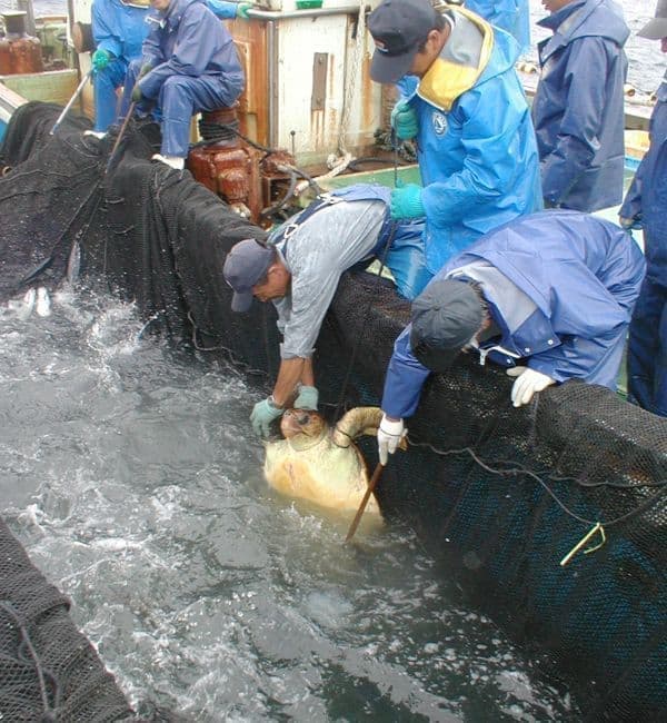 1.プラスチック製の標識は網に絡まりやすく、混獲や投棄された漁網にウミガメが絡まる原因とされている