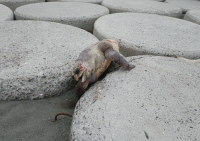 消波ブロックにはさまり息絶えたウミガメ