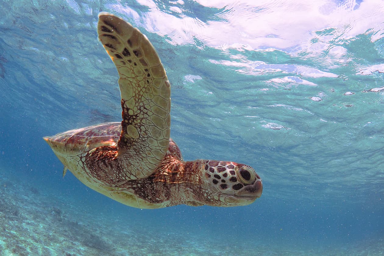 沿岸に住んでいるため、ダイビングで出会えることが多い種類です。海草・海藻を食べるベジタリアンですが、クラゲを食べることもあります。頭部はアカウミガメに比べて小さく、上顎と下顎の縁辺部が植物を食べやすいようにギザギザになっています。
