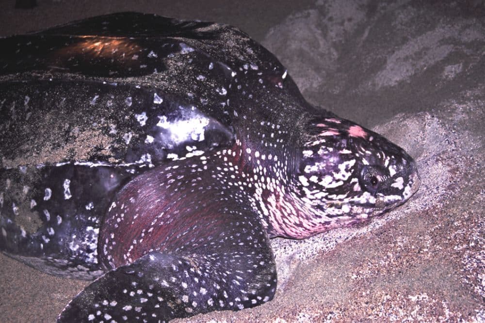 ウミガメ類の中で最大の種。直甲長は180cmに達し、体重は300kg以上にもなります。他のウミガメ類とは違い、甲羅に鱗板がなく、ゴムのような質感をしています。外洋で生活をしているため、日本で見られることは稀です。高知県の室戸市沿岸でも稀に発見されますが、ほとんどが未成熟個体です。