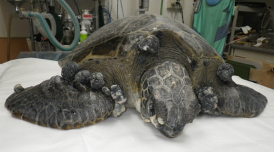 その他に、野生個体で特に注目されているのは、フィブロパピロマ(fibropapilloma)と呼ばれる奇病です。これは、鼠けい部、首や目の回り、口腔内、および内臓などに、1cmから30cmほどのカリフラワー状の腫瘍ができる疾病で、1938年にフロリダではじめて見つかった後、1980年前半になってからフロリダとハワイのアオウミガメで再発見され、現在では日本も含め、世界各地で見つかっています。罹患個体の大部分はアオウミガメですが、アカウミガメやヒメウミガメで見つかる例もあります。腫瘍が大きくなると視覚や摂餌が阻害されたり、漁網に混獲されやすくなるなどの弊害があります。以前は、死に至る不治の病と考えられていましたが、最近の研究では、自然治癒することも分かってきました。線維乳頭腫関連ウミガメヘルペスウイルスへの感染が原因と考えられていますが、詳しくはまだ分かっていません。