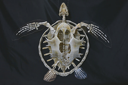 カメの甲羅は、骨甲板とその上の角質甲板の二重構造になっていて、背中側の背甲とお腹側の腹甲からなります。骨甲板は脊椎骨や肋骨と一体化しています。リクガメでは隣り合う骨甲板同士は隙間無く頑丈に繋ぎ合わさりますが、ウミガメ類の場合は隙間だらけになっています。オサガメに至っては隣り合う骨甲板同士が接合することはありません。また、オサガメの場合には、角質甲板はなく、甲羅は薄い皮膚で被われています。オサガメを除くウミガメ類では、甲羅の上の角質甲板を含めて、体の表面は角質化した鱗、すなわち鱗板が被っていて、主要なものにはそれぞれ名称があります。鱗板のうち、前額板、下顎鱗板、肋甲板、亜縁甲板などは、ウミガメの種を同定するうえで決め手となる形質の一つです。