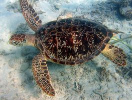 ウミガメは海に適応した結果、陸で暮らす他のカメに比べて様々な点で異なっています。まず、最も明らかなのは四肢の形の違いです。上のリクガメの写真を見ても分かるように、陸で生活するカメの足は指があり、陸を歩きやすいようになっているのに対し、ウミガメの足は舟のカイのような形をしています。もちろん、これは海中を自由に泳ぐために発達させたものです。しかし、そのかわりメスが産卵の際、砂浜を歩くのは大変になってしまいました。