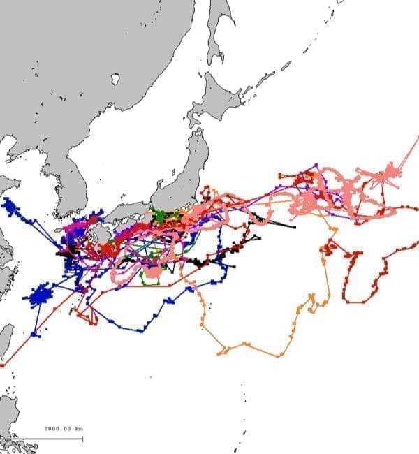 日本ウミガメ協議会は、産卵を終えたアカウミガメや、定置網などで捕獲されたアカウミガメ22個体に電波発信機を装着して追跡してきました。その結果、概して、体の大きさによって異なる回遊パターンを示すことが分かってきました。つまり、甲長800mm以下の比較的小さな個体は黒潮親潮混合域や黒潮続流域へ回遊していき、甲長833mm以上の比較的大きな個体は東シナ海へ向かい、そこで特定の海域に固執し、その中間の大きさの個体は、黒潮の南側を時計回りに周回しながら、時折日本列島に接岸するといった具合です。