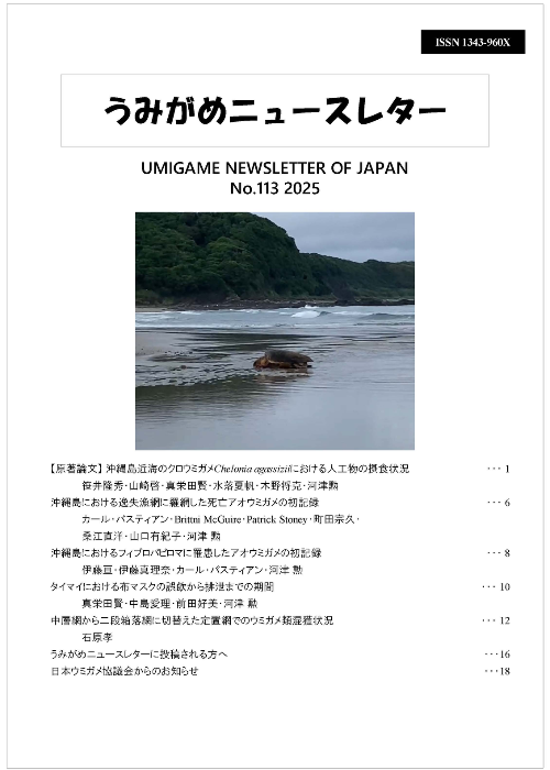 記事は投稿を原則としています。内容は個人またはグループ・機関等の情報の提供、研究内容の短報、提案、これらに対する意見など、ウミガメに関すること全般を扱ってます。発行は年2回です。配信をご希望の方は、住所・氏名・電話番号・ニュースレターを必要とする目的をお知らせください。また、行政・研究機関・環境アセスメント等に所属されている方は,所属先の明記をお願い致します。