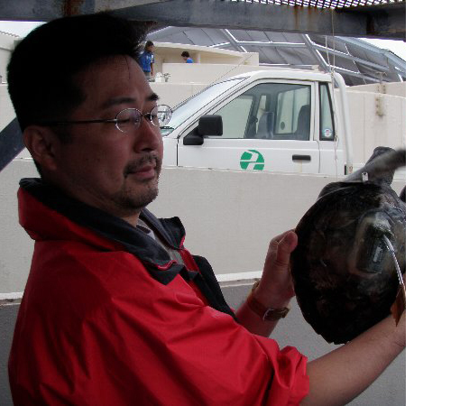 鹿児島県笠沙の野間池にある白瀬定置網のオーナー。定置網にウミガメが入ると、サイズを計測したのち標識を装着し、放流している。周年を通じて主としてアオウミガメが混獲される。息子さんはダイビングのガイドも営んでいる。