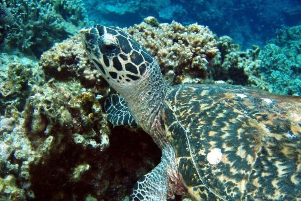 沿岸に住んでいるため、ダイビングで出会えることが多い種類です。海草・海藻を食べるベジタリアンですが、クラゲを食べることもあります。頭部はアカウミガメに比べて小さく、上顎と下顎の縁辺部が植物を食べやすいようにギザギザになっています。